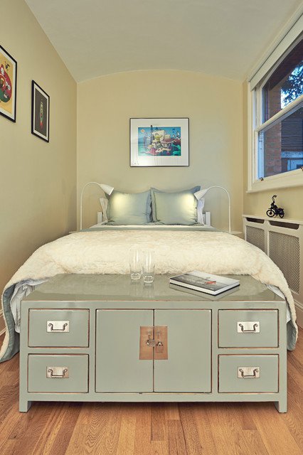 Lược bớt phần đầu giường thay vào đó căn phòng có thêm một chiếc tủ lưu trữ giúp căn phòng gọn gàng hơn